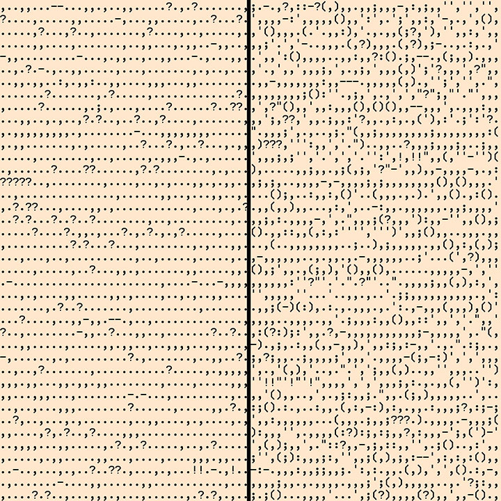 Calhoun, who studies fruit-fly mating practices by day, has written a few lines of computer code to strip the words from any block of text, leaving behind only the punctuation. He has applied his code to more than a dozen works of literature, ranging from William Faulkner’s Absalom, Absalom! to Cormac McCarthy’s Blood Meridian. The project began as an effort to find something visually interesting to hang on his wall.