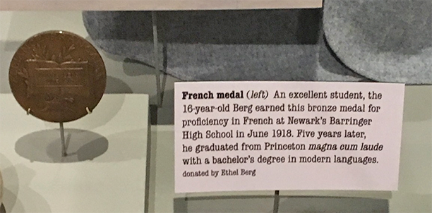 Rather than highlight the movie, the exhibit takes a documentary approach that contrasts it nicely to the entertainment that surrounds it throughout the Hall (e.g. the original San Diego Chicken costume) and meticulously uses key memorabilia thoughtfully collected and donated to the Hall by Berg’s family, including the Medal of Freedom. There are his mask and pristine jersey from his 1930s trip to Japan, a gift cigarette lighter from the Meiji University baseball team, and on and on, even through classified documents from WWII. Additionally, the Hall has put a large selection of Berg’s memorabilia online in its ever-improving digital collection, which beyond the unique history is just fun to peruse, such as the wonderful symbolism of his contract with my Chicago White Sox: the perfect coupling of a hitless catcher with a hapless franchise.