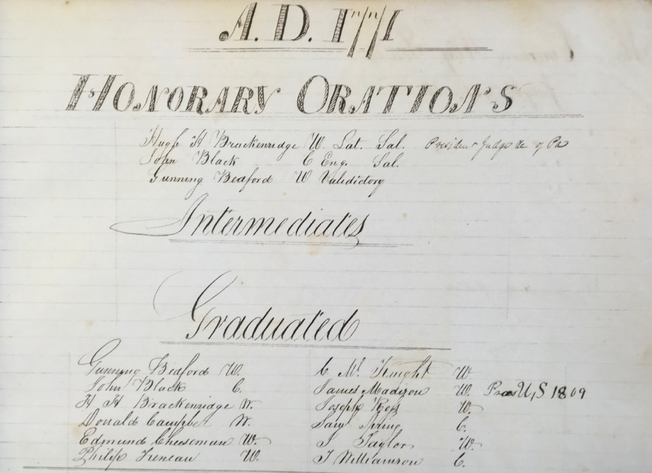 Freneau, a Jersey boy schooled by William Tennent Jr., New Side Presbyterian trustee of the College, arrived in 1768 as a 16-year-old sophomore with poems already in hand. He found under the newly arrived John Witherspoon not only a hothouse for his political fervor, but a community of young radicals who could amplify his decidedly non-clerical literary proclivities. A batch of them took one look at the dominant conservative Cliosophic Society on campus, and formed the American Whig Society to oppose its every move and thought. Madison, the Virginian, was one, William Bradford 1772 (who was three years younger than Freneau), the future attorney general of the United States, another; and then there was Hugh Henry Brackenridge 1771, an imposing Scotsman four years Freneau’s senior, who became his intellectual and literary co-conspirator. Freneau and Brackenridge wrote Father Bombo’s Pilgrimage to Mecca in Arabia, a slightly disguised political satire skewering the Cliosophs at every turn — and just in passing was seemingly the first sizable work of prose fiction in America. They then turned to an epic patriotic poem, written primarily by Freneau and delivered by Brackenridge at Commencement in September 1771, unsubtly entitled The Rising Glory of America. Running about 40 minutes, the ode predicts a great and idyllic nation stretching from the Atlantic to the Pacific, ending with these lines: