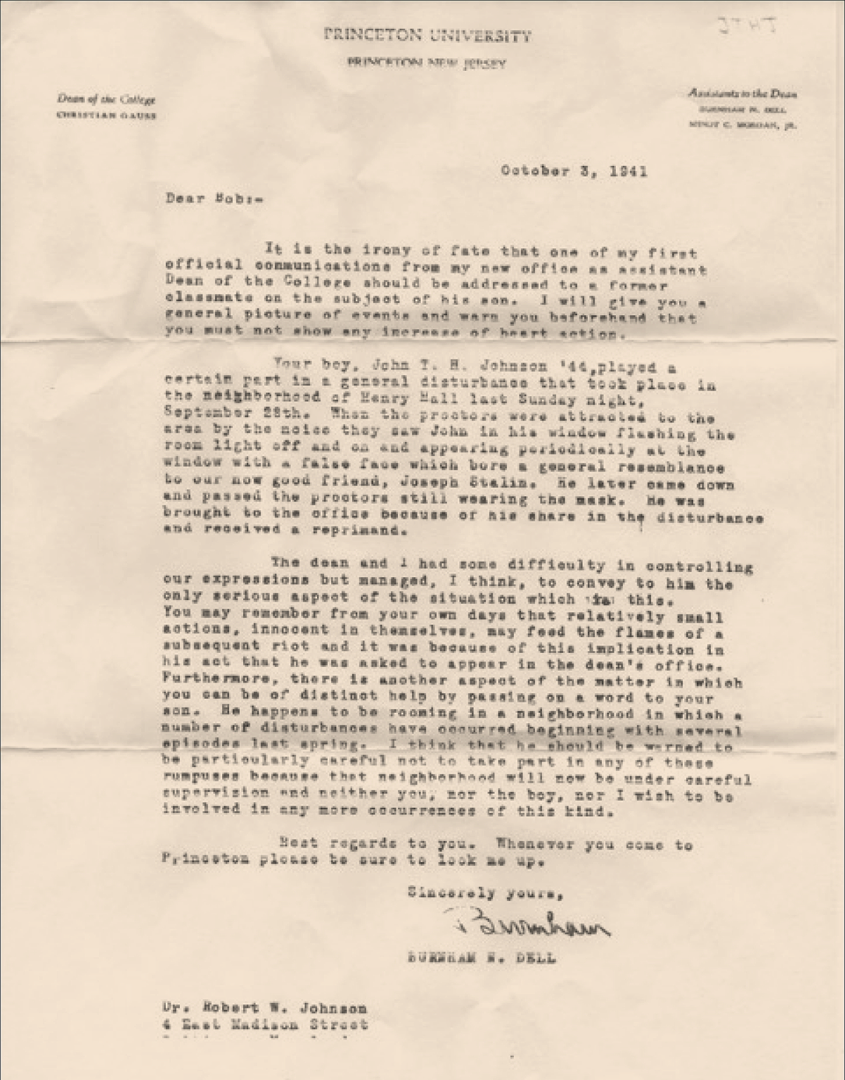 But of course (you knew there was an “of course” coming here, right?) that’s not really the message we want to consider, that’s just the surface distraction. The import of Burnham Dell’s letter is its deep, personal caring and detail of the old Princeton, where classmates watched out for their classmates’ sons, where a Stalin mask qualified as a rumpus, and where benevolent guidance from on high, including the deans, professors, and even proctors, was the unspoken contract under which the community thrived. The time and effort to conduct the interview, issue the warning, then construct a full-page letter (with carbon copy!) speaks to priorities of the college then; even considering all the shortcomings of in loco parentis as policy, who’s to say kindness and concern are bad for 19-year-olds?