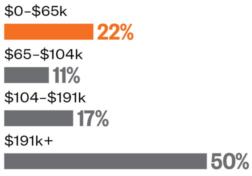 The Class of 2018 includes a record 290 students from low-income backgrounds (defined as the lower three quintiles of U.S. household income: less than $65,000). That’s 22 percent of the class, up from 19.7 percent of freshmen defined as low-income a year ago and 10.6 percent a decade ago. The Class of ’18 family income: