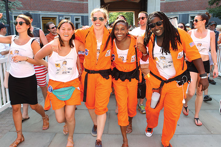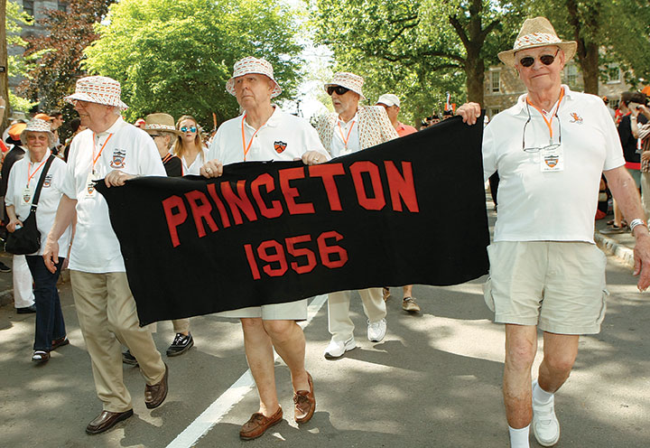 They joined about 26,000 alumni and guests who returned to campus wearing all things orange and black for Reunions May 26–29. As usual, the P-rade was the highlight for many alums — despite the 90-degree heat. Joseph Schein ’37, at 101 the oldest returning alumnus from the earliest class represented at Reunions, led the procession with the silver-tipped Class of 1923 cane in hand, walking the entire way. Several signs carried in the P-rade took a serious tone, including some referring to racism and the 2014 killing by police of Michael Brown in Ferguson, Mo. Some alumni toted signs asking for support for sprint football, which Princeton is ending. But others were more lighthearted, combining references to Princeton’s past with wry humor about the passing years. The signs of the “palindrome Class of 1991” — keeping with the “Tiger Regit” theme — drew on classmates’ wordplay skills, such as: “Lager, sir, is regal,” “Yale delay,” “Campus Motto: Bottoms up, Mac!”