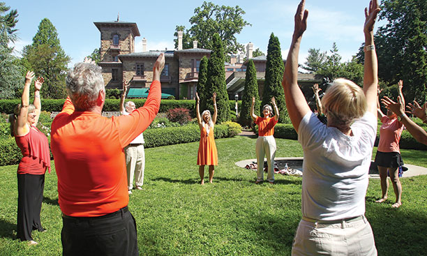 Nadia Linda Chiu Hole ’75, in orange dress, leads a morning Qigong session in Prospect Garden.