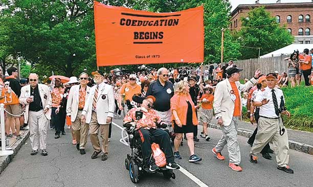 Some P-rade marchers received especially loud applause and locomotives, including the Old Guard members who left their golf carts to walk; unicyclists Jay Lehr ’57 and Steven Gubser ’94 *98 and daughter Lillian; and Jim Isenberg ’73, a mathematics professor at the University of Oregon who — though paralyzed below the neck in an accident in December 2017 — led his class down the route in a wheelchair. As usual, ’73 classmates carried the “Coeducation Begins” banner, which drew strong cheers in this 50th anniversary year of undergraduate coeducation.