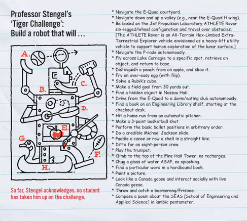 Stengel has proposed a number of research topics of his own, some of which are part of what he has called the Tiger Challenge (see the list, page 32). They challenge students to design a robot that can perform one of several unusual tasks — from kicking a 30-yard field goal to doing the Michael Jackson moon walk to navigating from the E-Quad to one of the eating clubs. All of them are theoretically doable but some, Stengel acknowledges, “are more preposterous than others.” So far, no student has taken Stengel up on any of the challenges on the list.