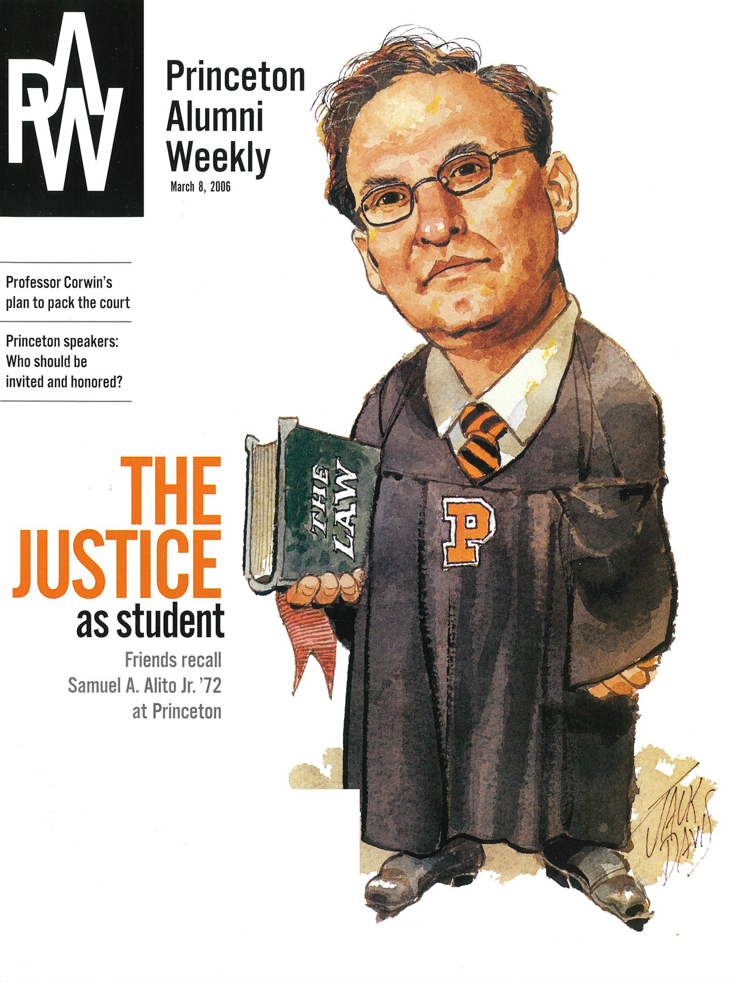 She’s the person responsible for the full-page photos that open our On the Campus and Princetonians sections. She takes special pride in three PAW covers: an image of Supreme Court Justice Samuel A. Alito ’72 by the late, great illustrator Jack Davis (March 8, 2006); a photograph of Professor Jeff Nunokawa by Ricardo Barros (March 23, 2011); and last year’s cover by textile artist Diana Buri Weymar ’91, honoring alumni who worked on the front lines of the COVID pandemic (May 13, 2020). (Scroll down to see all three below.) “This job has allowed me to work with some of the world’s best photographers and illustrators,” Marianne says. “And PAW’s articles have introduced me to the most amazing Princeton alumni and professors.”