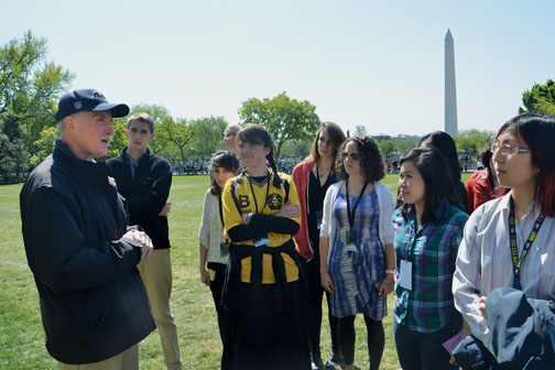 The University’s Bee Team – students who maintain two beehives on the West Windsor fields – paid a visit to the White House April 13. They collected tips from White House beekeeper Charlie Brandts (above, left) and left jars of Princeton honey for first lady Michelle Obama ’85 and for White House staff members. Rocky Semmes ’79 sponsored the trip after learning that Obama had included a beehive in the White House Kitchen Garden.
