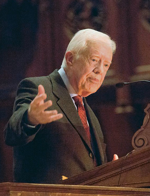 Former president JIMMY CARTER, above, addressed issues of gender equality and sexual violence around the world when he spoke in the University Chapel Dec. 3. But what may have resonated most with the campus crowd of 800 were his comments about sexual violence on college campuses.