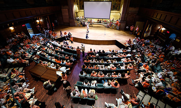 For 30 minutes after this year’s storm, much of the campus was in free-for-all mode. Some alumni waited it out in Richardson Auditorium, one of several locations where impromptu performances began. The Class of 1973 brought a boom box inside to play music; soon people climbed on stage and began singing and reciting poetry. Some classes raised their banners and attempted to keep marching on Elm Drive, with one member of the Class of 2006 chanting “Renegade P-rade!” Down the hill, some seniors and young alumni remained in celebration mode, floating in kiddie pools and playing games until a downpour with thunder began about 3:15 p.m., causing many of the last holdouts to seek shelter indoors.