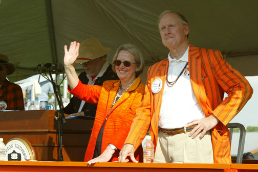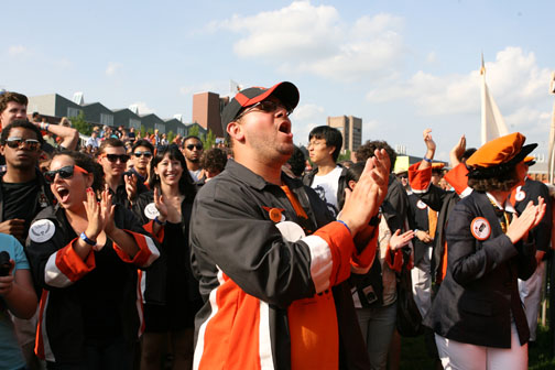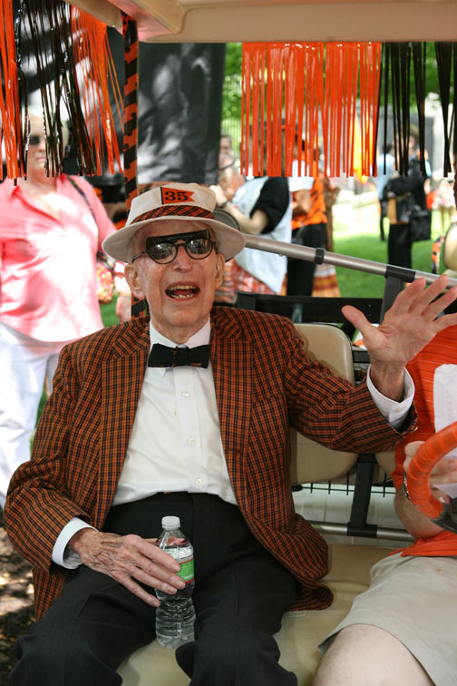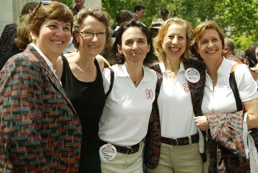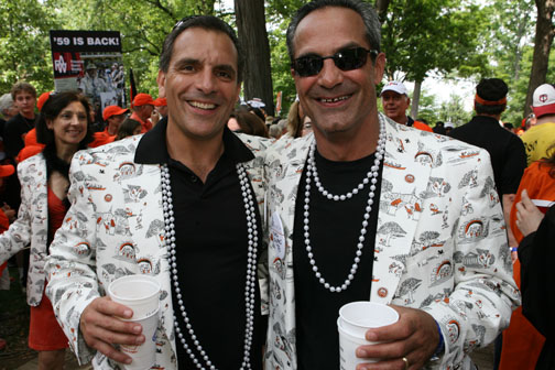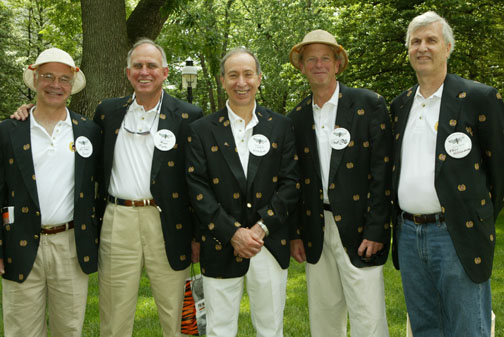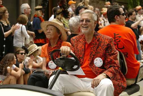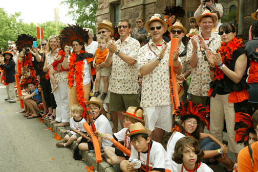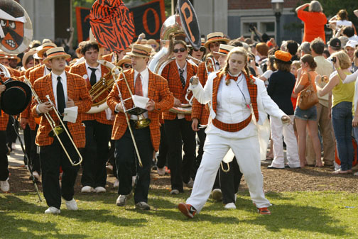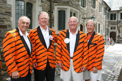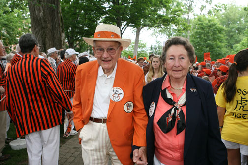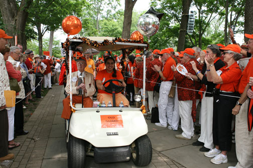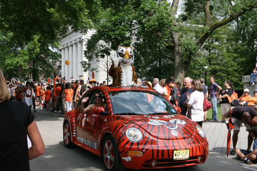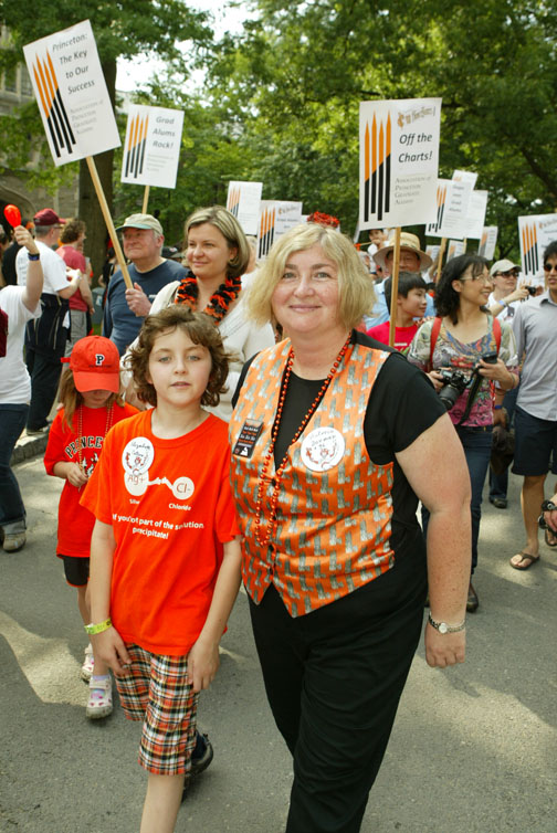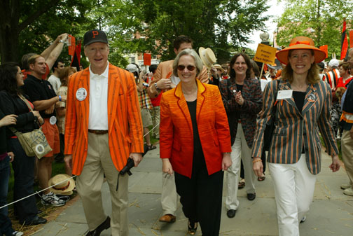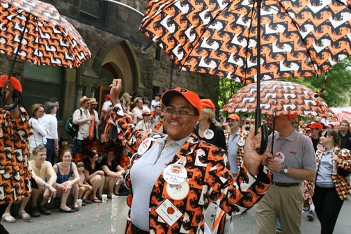 The Princeton Tiger travels the P-rade route in style. Malcolm Warnock ’25 carries the Class of 1923 cane for the sixth time as the oldest returning alumnus (he would turn 105 June 21). His driver is Ariana Vera ’12. Stepping smartly are Steve Oxman ’67, chairman of the executive committee of the University’s board of trustees; President Tilghman; and Anne Sherrerd *87, president of the Alumni Association. Displaying their new reunion jackets as part of the Class of 1985’s Roarin’ 25th are Pete Noto, left, and Chris Collaros. Oliver Langenberg ’35, one of three classmates who returned for their 75th reunion, offers a smile and a wave. Gordon Griffin ’40 and Bob McEldowney ’40 acknowledge cheers from P-rade spectators. Irma and Dick Beltram ’45, back for the class’s 65th reunion. Tom Paine ’50 enjoys a warm reception from younger alumni. Gordon Douglas ’55 leads his classmates in a locomotive. Carla and Tom Latta ’60 as the 50th-reunion class makes its way down the P-rade route. From the Class of ’65 are, from left, Cosmo Iacavazzi, John Diekman, Johnny O’Brien, and Bud Maddocks. Returning for their class’s annual “bugfest” are, from left, Michael Hays ’70, Ralph Taylor ’70, John Nonna ’70, Edward Gwazda ’70, and Ken Hallock ’70. Beverly Canzater Jacobs ’75 shows off one of the class’s new “transposing tigers” umbrellas. Demonstrating the Class of 1980’s “Together Again” theme are, from left, Dotty Sparks Blake ’80, Ellen Dunham-Jones ’80 *83, Debra Firstenberg Kushma ’80, Jill Baron ’80, and Marie Stoess Schwartz ’80. Marching in the P-rade with the graduate alumni are Victoria Dorman *96 and her daughter, Elizabeth Petrov. Members of the Class of 1990 applaud older alumni as they wait their turn to join in the P-rade. Sporting flight jackets and aviator shades as part of the Class of 1995’s “Top Tiger” theme are, from left, Jess Gonzalez ’95, Soo-Jin Cho ’95, and Eileen Rojas ’95. Candace Jackson ’00 takes onlookers back a decade as she marches in the P-rade. Travis Muir ’05 displays his superhero-themed outfit with an apt pose. The Princeton University Band leads the Class of 2010 onto Poe Field. The University’s newest alumni, the Class of 2010. President Tilghman greets a passing class as Steve Oxman ’67, chairman of the executive committee of the Board of Trustees, looks a bit bemused.Newsletters.