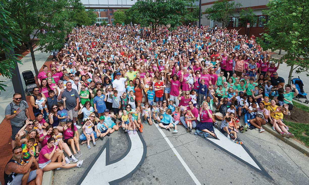 Since 1997, CHOP has been holding annual “fetal family reunions” of families and kids who have been cared for by the Center for Fetal Diagnosis and Treatment. A lineup of photographs hangs in one of the hospital’s hallways. In the first photo, the babies and small children in laps are vastly outnumbered by parents and CHOP caregivers. By 2014 the photo session was moved outdoors to accommodate everyone. In 2019, there were 2,500 attendees; the photographer needed to perch high in a cherry-picker to capture the entire scene. If you look closely, you can see Bill Peranteau in the front row.