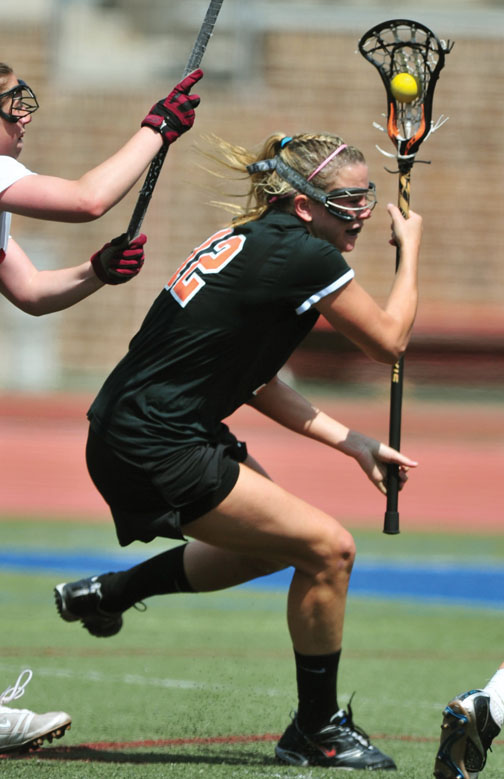 Charlotte Davis ’13, left, scored three goals, including the game-winner, as WOMEN’S LACROSSE came from behind to beat Harvard, 12–10, in the Ivy League Tournament final May 8. The victory earned Princeton an automatic bid to the NCAA Championships and capped an extraordinary weekend that began with an upset win against host Penn May 6. Princeton topped the Ivy co-champion Quakers twice in three weeks, leading Tiger head coach Chris Sailer to quip that Franklin Field was fast becoming her team’s “new favorite field.”