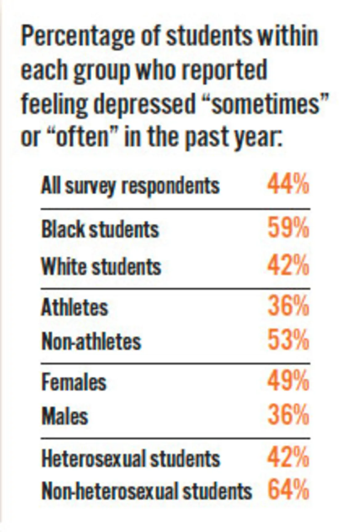 African-American and female students at Princeton were significantly more likely than other students to report feeling depressed, while athletes were less likely to do so, according to the results of an Undergraduate Student Government survey conducted last summer. And students who identified themselves as gay or lesbian, bisexual, queer, asexual, or “unsure” were more likely to report feeling depressed than heterosexual students were.