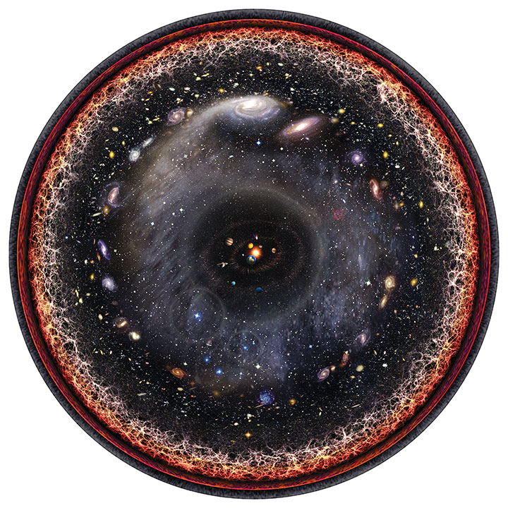 This illustration by Pablo Carlos Budassi depicts the known universe. It was created using a map of the universe developed in 2005 by Princeton astrophysics professors Richard Gott *73 and Neta Bahcall, along with Mario Juric *07, David Schlegel ’89, Michael Vogeley ’87, and other researchers. Set in the center is our solar system.