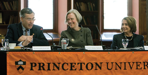 From left, Rep. Rush Holt, D-N.J., President Tilghman, and Speaker of the House Nancy Pelosi, D-Calif., organized a roundtable with more than 20 leaders from government, industry, and academia to discuss America’s commitment to research in the physical sciences and energy Dec. 15 in Chancellor Green. In a press briefing afterward, Tilghman said it is important for the United States to “make a very serious investment in the kind of innovation and creativity that has always fueled this country and its economy.” Pelosi concurred and thanked the panel for a “master class” on pressing issues in the sciences. “We need your intellectual resources,” she told the panelists, “but also, we need you as advocates.”