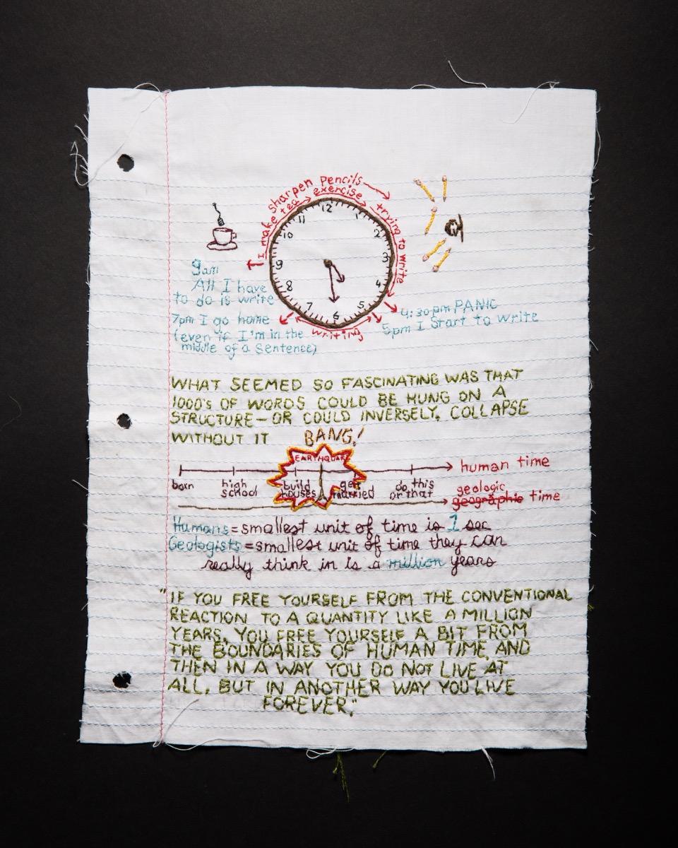 Her own collection included “The John McPhee Sampler,” a set of hand-embroidered pages threaded with the text — the letter forms — of the work of John McPhee ’53, a Pulitzer Prize-winning master of literary nonfiction who has taught at Princeton since 1974. The excerpt that Weymar’s cotton thread traces is made, somehow, into more than a text, or even the written word. The “Sampler” spells out the words; it also illustrates.