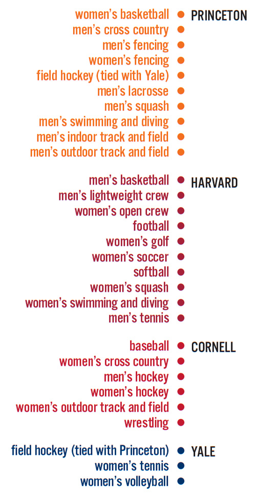 Princeton teams tied Harvard for the most Ivy League championships in 2011-12. Princeton won the tally outright for the previous six years, including a record 15 wins in 2010-11. In the unofficial all-sports standings, in which the schools receive points based on each team’s performance, Princeton finished first in the Ivy League for the 26th straight year.