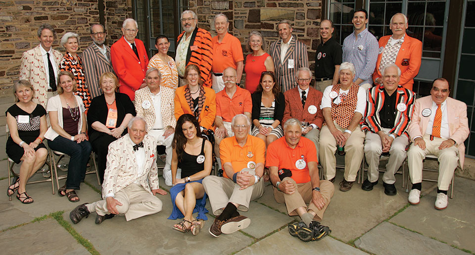 Class secretaries and memorialists were feted by PAW at a reception May 30 at the Bendheim Center for Finance. Seated in front are, from left: Jay Siegel ’59, Jen Adams ’01, George Brakeley ’61, and Barry Bosak ’62; middle row: Class Notes editor Fran Hulette, Amy Oversmith ’94, Janet Grace w’44, Tom Meeker ’56, Adrienne Rubin ’88, Glenn Morris ’72, Laura Redman ’03, Edward Essertier ’43, Paul Sittenfeld ’69, Mark Swanson ’71, and Charles Ganoe ’51; standing in back: Donald Fox k’39, Melissa Kiser ’75, Eli Schwartz *60, George Pearson ’47, Malaika Walton ’87, Mike Parish ’65, Steve Whelan ’68, Leslie Fitzgerald h’39, Tim Butts *72, Brooke Stoddard ’69 k’37, P.G. Sittenfeld ’07, and Ken Michaelchuck ’68.