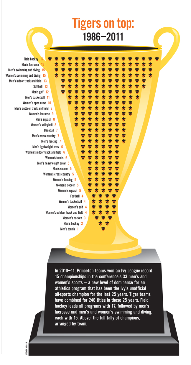 In 2010–11, Princeton teams won an Ivy League-record 15 championships in the conference’s 33 men’s and women’s sports — a new level of dominance for an athletics program that has been the Ivy’s unofficial all-sports champion for the last 25 years. Tiger teams have combined for 246 titles in those 25 years. Field hockey leads all programs with 17, followed by men’s lacrosse and men’s and women’s swimming and diving, each with 15. Below, the full tally of champions, arranged by team.