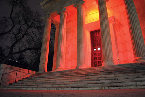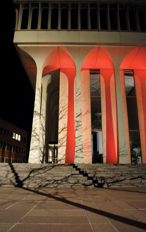 The lights on Clio Hall, above, and Robertson Hall took on a different hue from Nov. 27 to Dec. 3 as the Student Global AIDS Campaign (SGAC) marked World AIDS Week. The group sponsored speakers, student-led discussions, and fundraisers with a theme of “Princeton Positive,” estimating that 1 in 500 college students is HIV-positive. Also bathed in red lights were Whig and McCormick halls, Frist Campus Center, and Holder Courtyard.