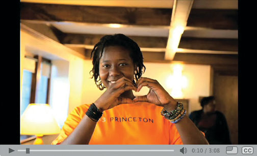Hundreds of Princetonians — including undergraduate and graduate students, the Tiger mascot, members of the band, faculty members, public-safety officers, and President Tilghman — make brief appearances in a video as they form the shape of a heart with their fingers. The simple message? We love Princeton. “I <3 Princeton,” produced by the University’s communications office, has been viewed more than 34,000 times on YouTube and social-media sites.