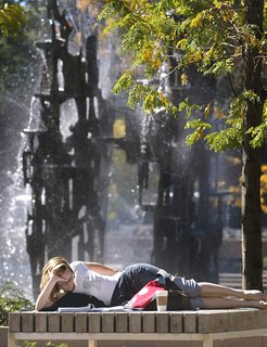 Good day sunshine: At right, Elizabeth Gummerson, a first-year Ph.D. student at the Woodrow Wilson School, took advantage of the summer-like weather Oct. 9 to hit the books by the fountain next to Robertson Hall.