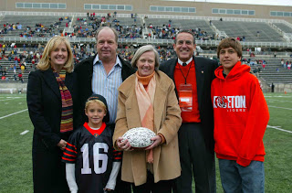 Bill Powers ’79, standing second from left, and members of his family were recognized by the University during the Dartmouth game for Powers’ $10 million gift to Princeton’s football program, the largest donation ever to Princeton athletics. Powers, a managing director of the California-based Pacific Investment Management Co. and a former All-Ivy punter, also gave $500,000 to establish two scholarships. The University is naming Princeton Stadium’s artificial-turf field Powers Field in the family’s honor. From left in the photo are Powers’ wife Carolyn, Powers, their son Will, President Tilghman, Director of Athletics Gary Walters ’67, and Powers’ stepson, Tommy Cleator.