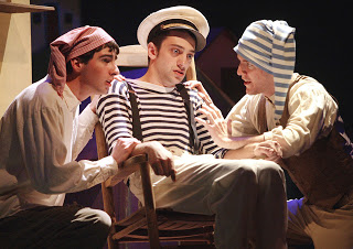 From left, Michael McMillan ’09, Dan Kublick ’08, and Steve Pearson ’09 are shown in a scene from Theater-Intime's performance April 7 of Dylan Thomas’ “Under Milk Wood.” The play details a day in the life of a small Welsh village.