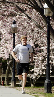 The colors of spring are in the air as Brian Strom ’06 jogs along University Place April 20.