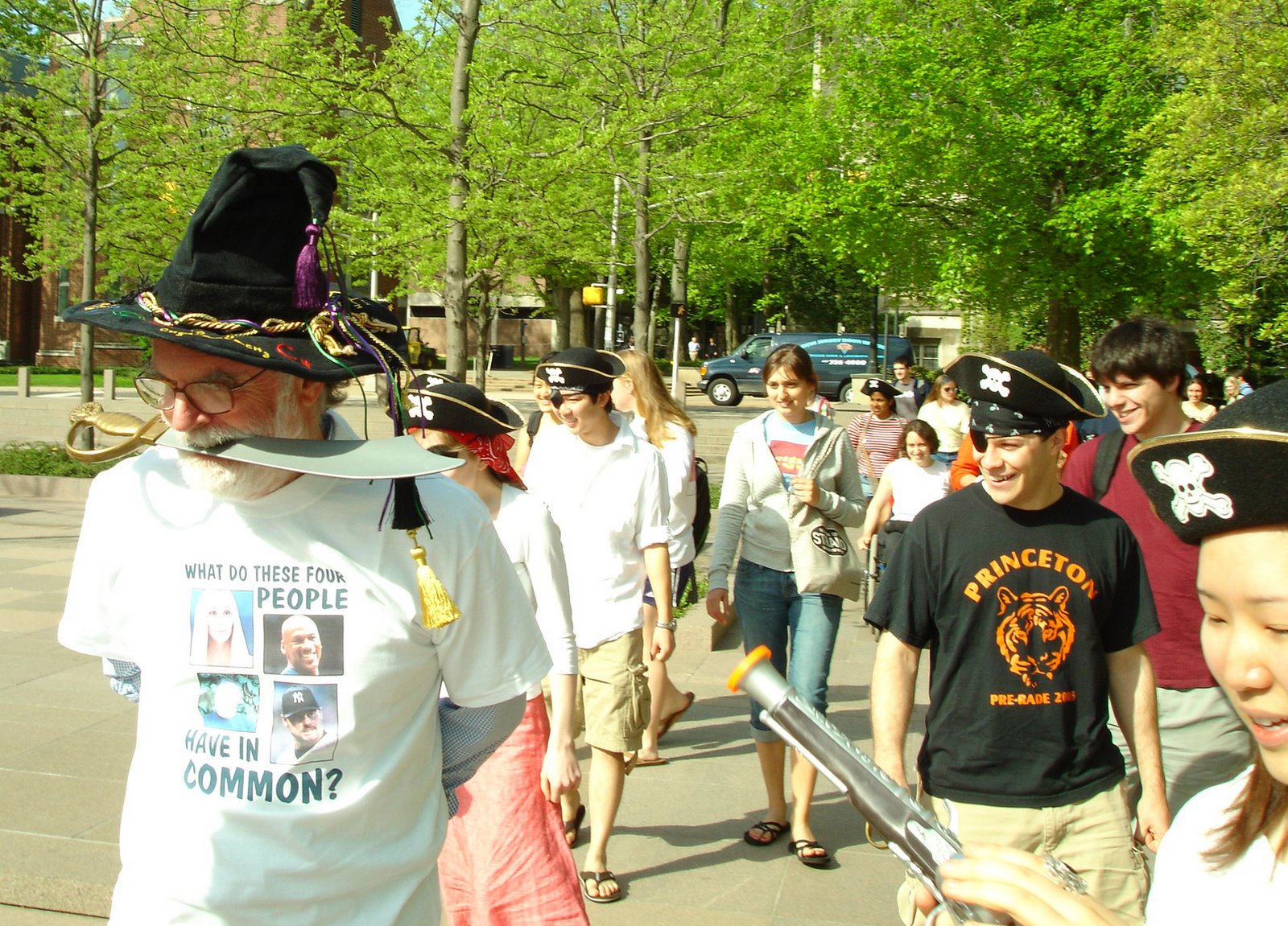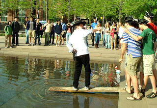 Soon after that comment, Jones’ lecture was cut short when a group of former students dressed as pirates rushed the aisles and staged a mutiny of sorts, presenting Jones with a treasure chest that included a hat, two T-shirts, and – as if on cue – generous supplies of erasers and chalk, wrapped in gold foil. But the prizes came with a price: the students tied Jones’ hands and took him outside to the fountain next to Robertson Hall, where they forced him to walk the plank. Jones did not go quietly, freeing one hand and playfully jousting with a plastic sword, but he eventually obliged, plunging ankle-deep into the water.