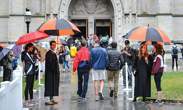But despite the day’s steady rain, the 1,342 freshmen made the best of their welcome to Princeton. Alumni, parents, and others along the Pre-rade route made up for their small numbers with rousing cheers. “It was amazing to have alumni there, that they came out in the rain,” Isabel Koran ’22 said. “Princeton sticks with you.” The Step Sing — held on Alexander Beach instead of Blair’s steps — turned into a big dance party, complete with a conga line.