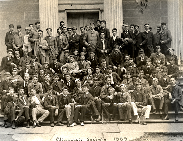 Members of the Cliosophic Society gather for a group photo on the steps of Clio Hall in 1889.