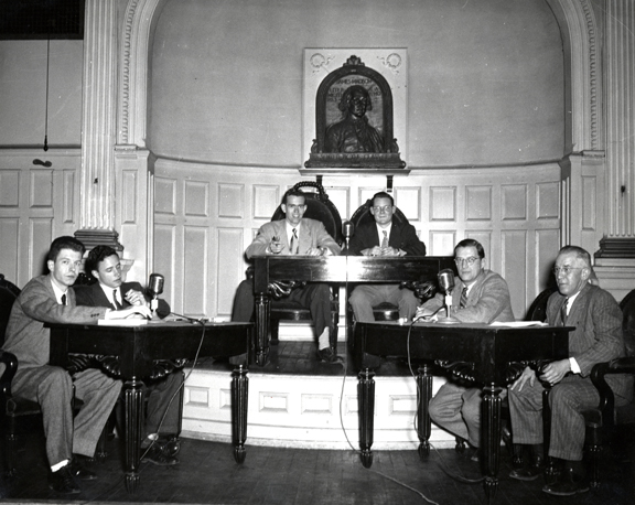 At the speakers table of Whig-Clio’s annual banquet in 1950 are, from left, University President Harold Dodds *14, Sen. Leverett Saltonstall of Massachusetts, Whig-Clio president Donald E. Stokes ’51 *52, Sen. H. Alexander Smith 1901 of New Jersey, and professor Wilber S. Howell, faculty adviser.