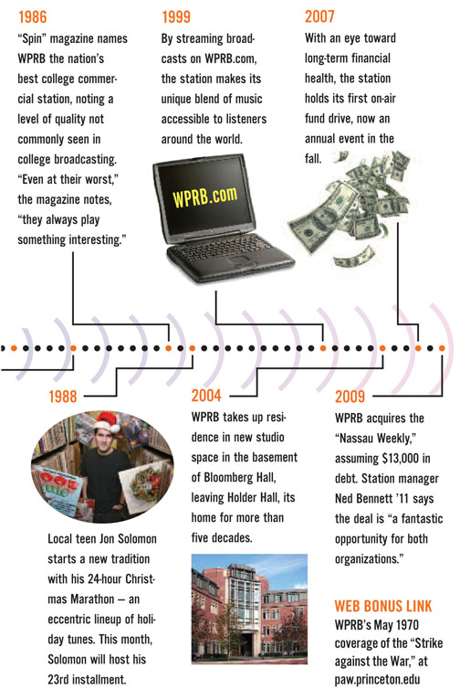 Dec. 15 marks the 70th anniversary of campus radio at Princeton, a venture that was launched in a junior’s dorm room and now occupies 2,700 square feet in the basement of Bloomberg Hall. WPRB’s broadcast schedule still includes the classical tunes that were part of its early repertoire, along with jazz, opera, world music, rock, news updates, and sports coverage. Following is a timeline of highlights from WPRB and its predecessor, WPRU.