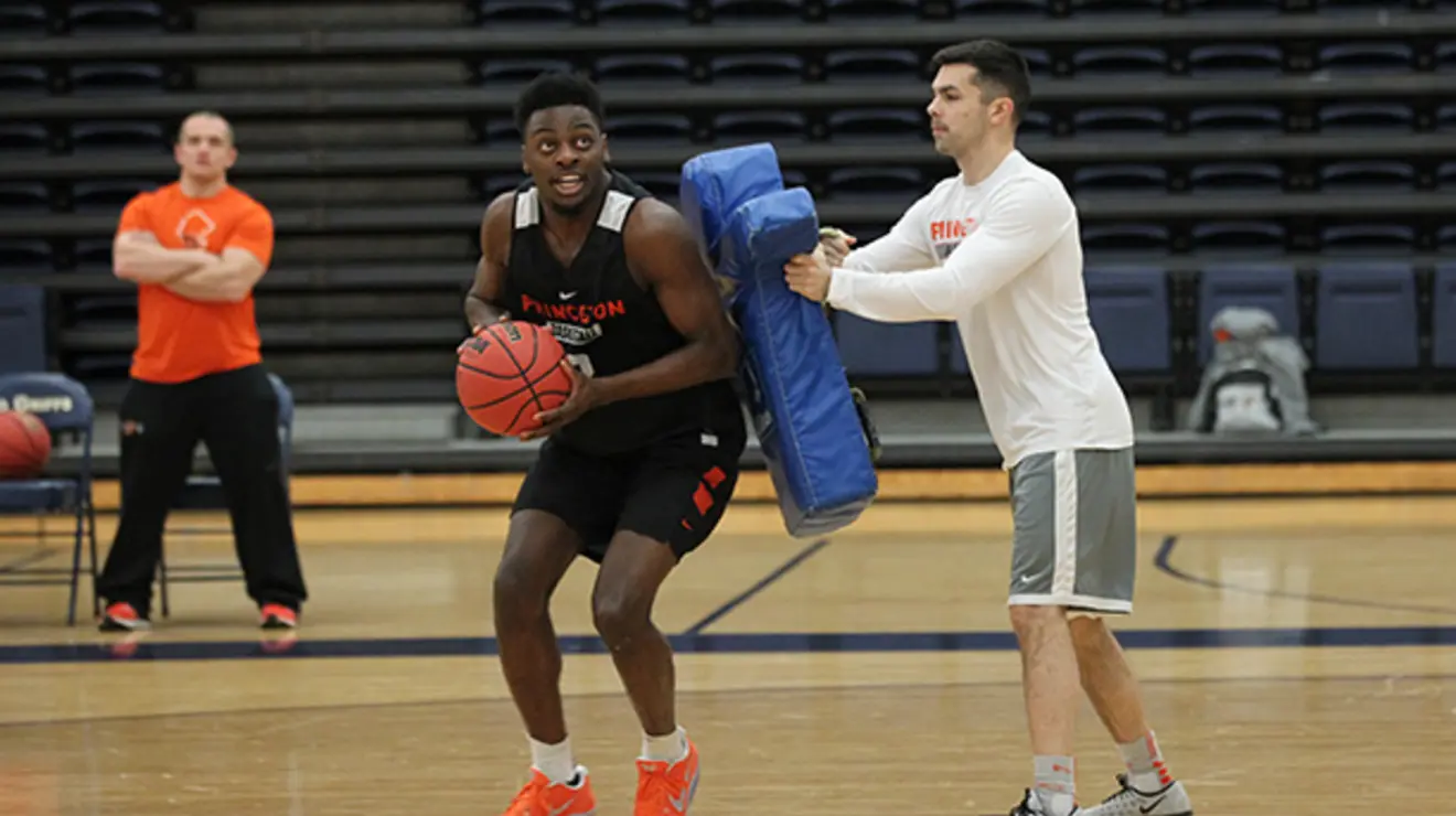 Myles Stephens ’19, left, and assistant coach Brett MacConnell prepare for the NCAA Tournament during a March 14 practice at Canisius College.